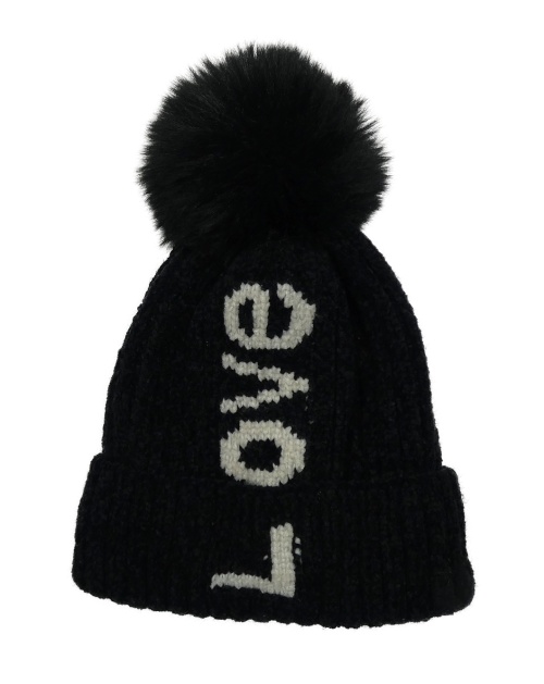 Černá žinylková čepice s nápisem a bambulí