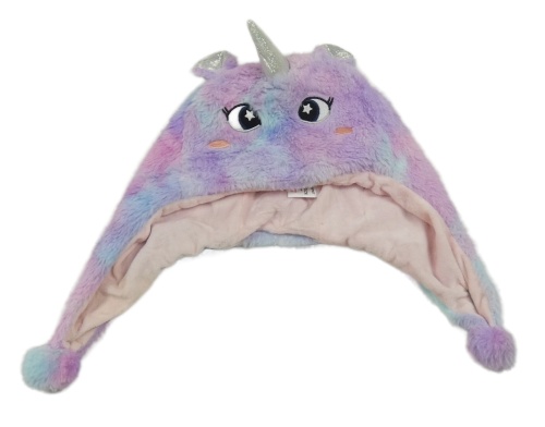 Fialovo-modrá kožešinová čepice s bambulemi a čumákem - jednorožec