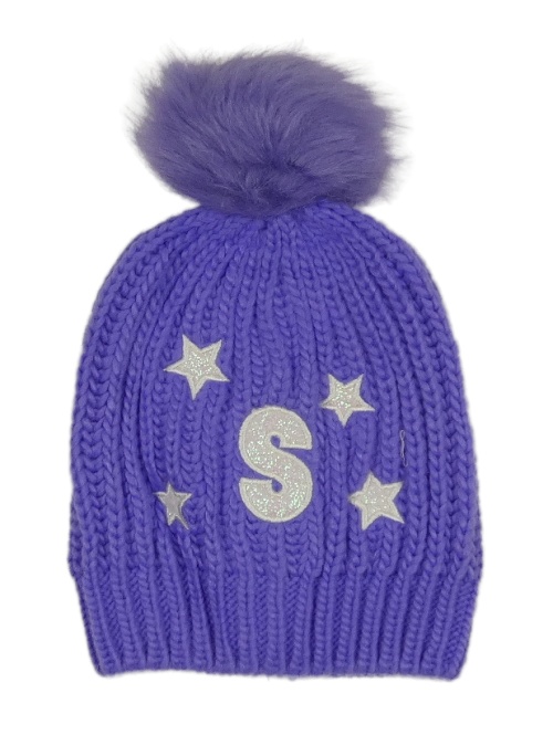 Fialová žebrovaná pletená čepice s písmenkem a hvězdičkami a bambulí
