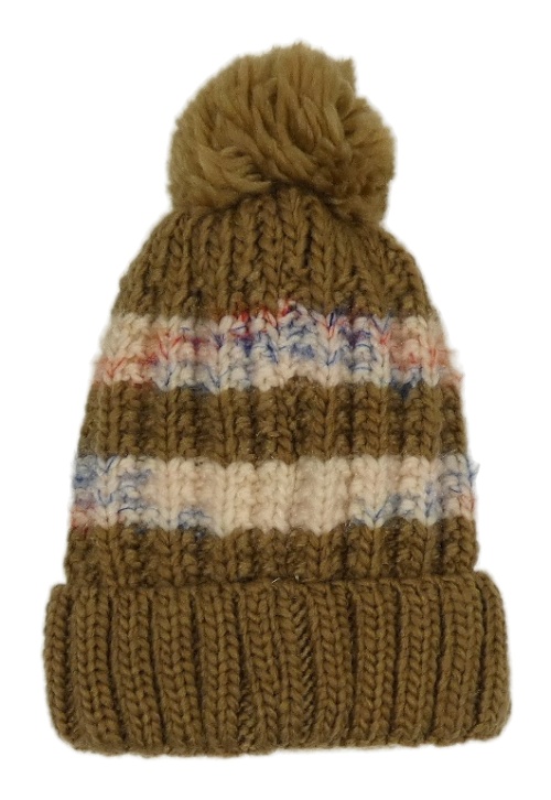 Bronzová žebrovaná pletená čepice s pruhy a bambulí