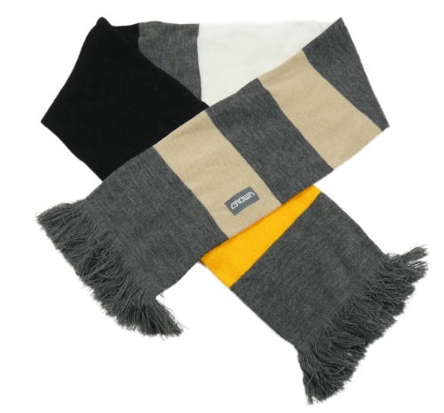 Šedo-béžovo-bílá pruhovaná pletená čepice s třásněmi