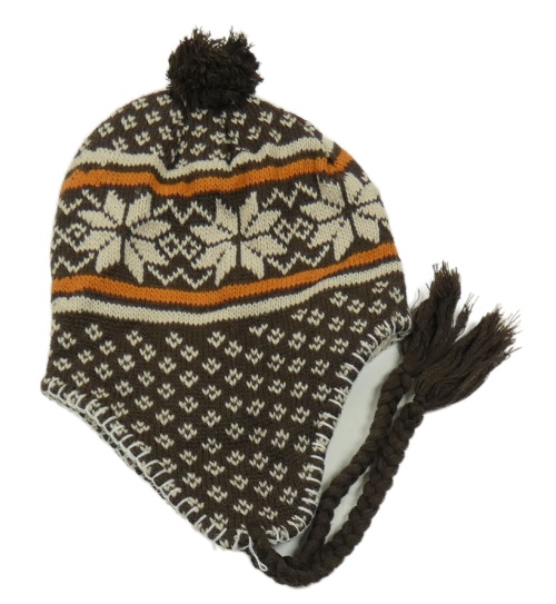Tmavohnědá vzorovaná pletená čepice s vločkami a pruhy a bambulí