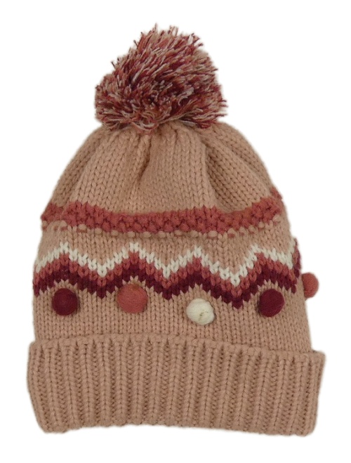 Starorůžová pletená podšitá čepice se vzorem a bambulkami Pusblu