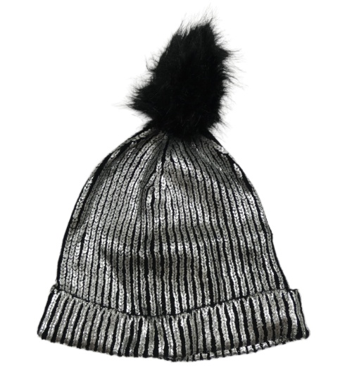 Černo-stříbrná pletená čepice s bambulí
