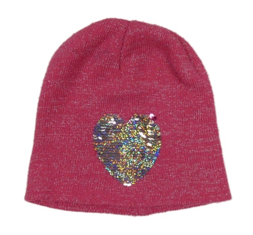 Tmavorůžovo-stříbrná melírovaná čepice se srdíčkem z překlápěcích flitrů