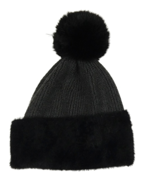 Šedo-černá melírovaná žebrovaná pleteno/kožešinová čepice s bambulí