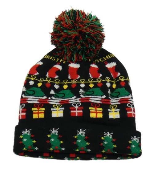 Černo-barevná pletená vánoční čepice s bambulí