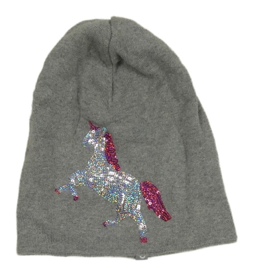 Šedá melírovaná čepice s jednorožcem z flitrů