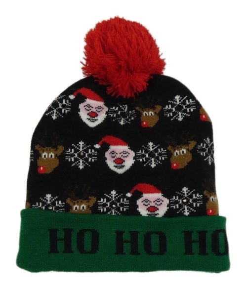 Černo-tmavozelená pletená vánoční čepice se Sandy a soby a žárovičkami a bambulí