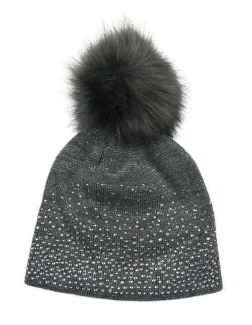Šedo-stříbrná pletená čepice s kamínky a bambulí