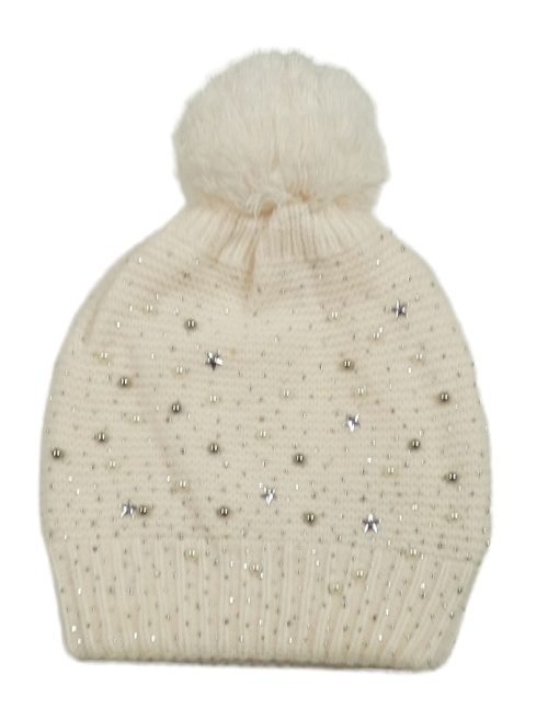 Smetanová pletená čepice s kamínky a perlami a hvězdičkami a bambulí F&F