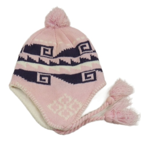 Růžovo-fialová vzorovaná čepice s bambulemi