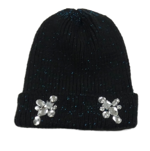Černo-modrá pletená žebrovaná čepice s kamínky