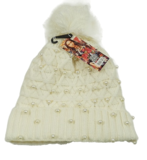 Nové - Smetanová vzorovaná pletená zateplená čepice s perlami a bambulí