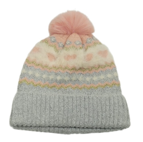 Světlemodro-smetanovo-růžová vzorovaná čepice s bambulí Tu