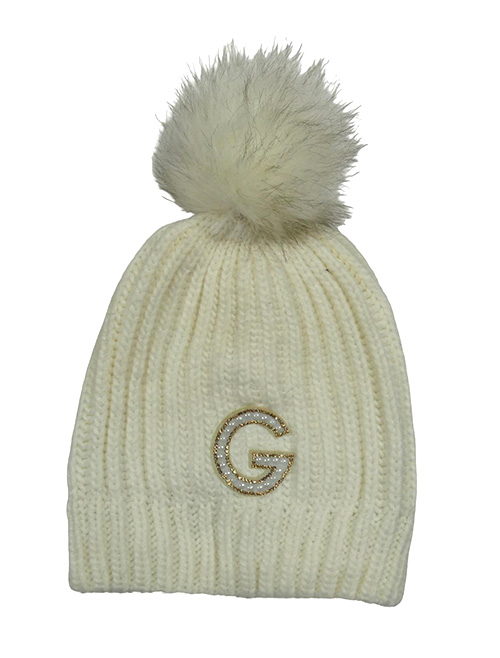 Smetanová pletená čepice s písmenem s kamínky a perlami