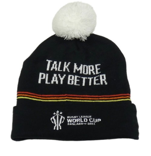 Černo-bílo-barevná čepice s nápisem a bambulí