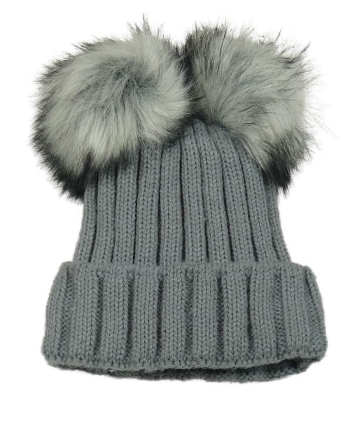 Tmavošedá žebrovaná pletená čepice s bambulemi