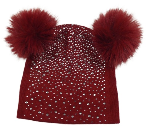 Červená čepice s kamínky a bambulkami