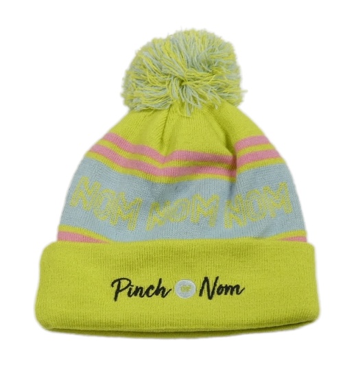Limetkovo-světlemodro-růžová čepice s nápisy a bambulí