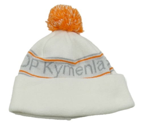 Bílo-oranžovo-šedá pletená čepice s nápisy a pruhy a bambulí