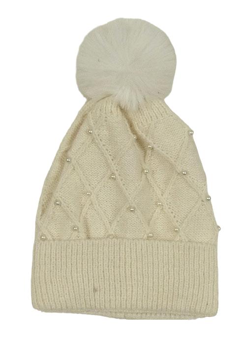 Smetanová čepice s perlami a bambulí