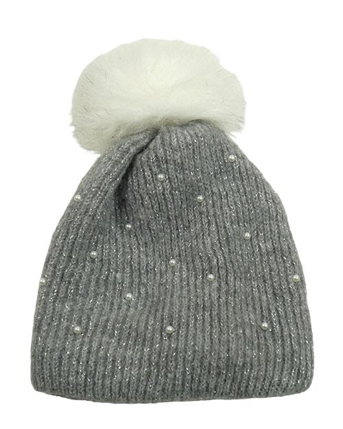Šedá třpytivá pletená čepice s perlami a bambulí C&A