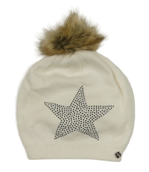 Smetanová pletená čepice s hvězdičkou z kamínků a bambulí
