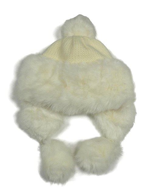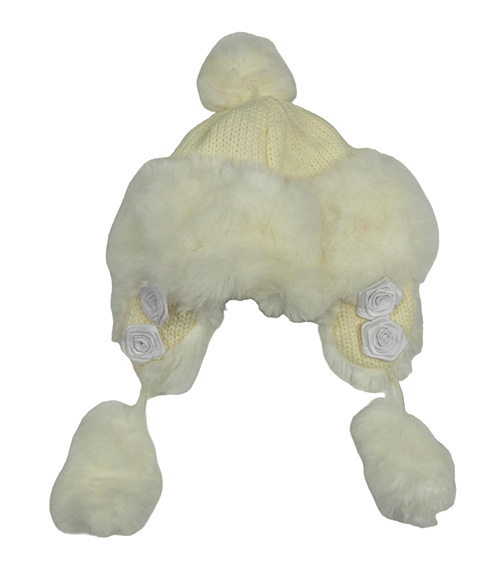 Smetanová pleteno/kožešinová čepice s bambulemi