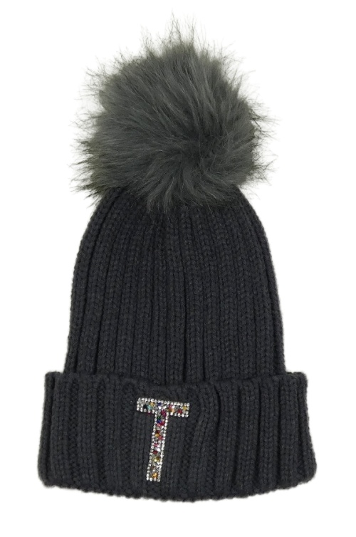 Antracitová pletená čepice s písmenem z kamínků a bambulí