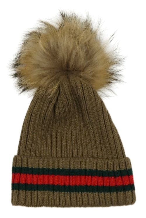 Hnědá žebrovaná pletená čepice s pruhy a bambulí