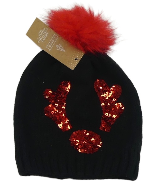 Nové - Černá pletená čepice se sobem z flitrů a bambulí