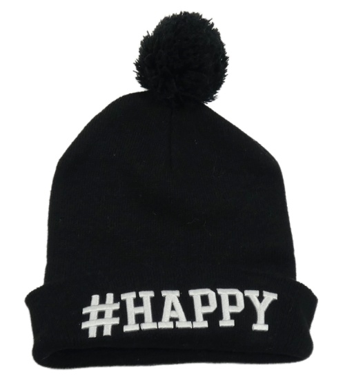 Černá čepice s nápisem a bambulí
