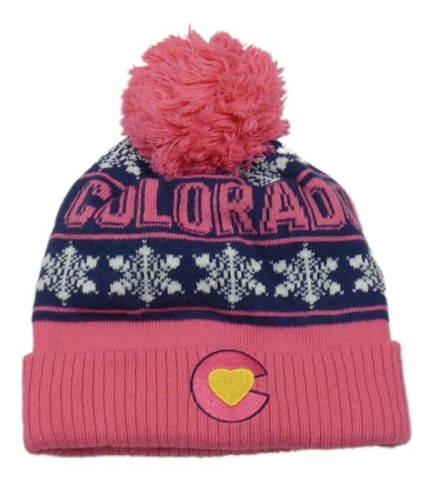 Tmavomodro-růžová vzorovaná pletená čepice s výšivkou a bambulí