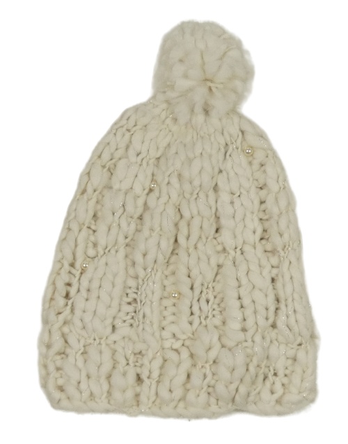 Bílá pletená čepice s korálky a bambulí vel. 12-16 let