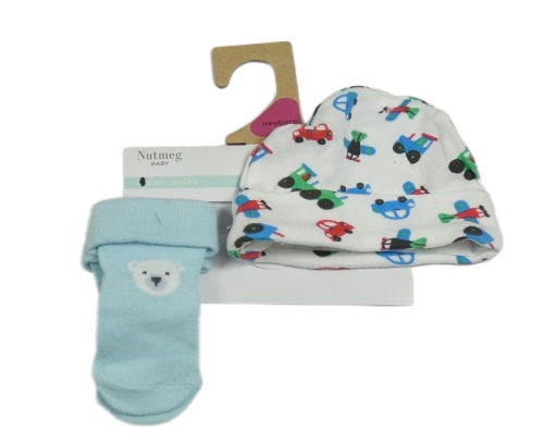 Nové - 2set - Bílá čepice s auty + světlemodré ponožky s medvídky