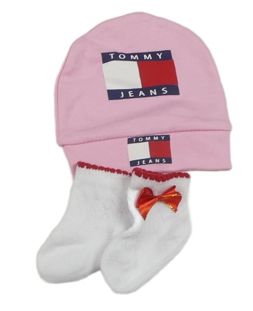2set - Růžová bavlněná čepice s logem- Tommy Hilfiger + bílé ponožky s mašlí