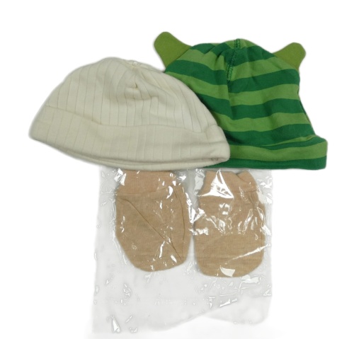 Nové - 3set - Smetanová čepice + zelená pruhovaná čepice + béžové rukavice