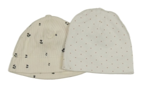2x Bílá puntíkovaná + smetanová kytičkovaná čepice