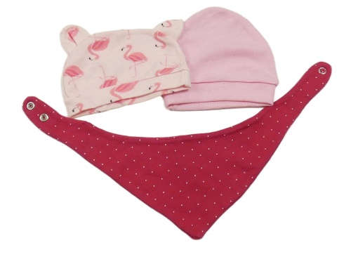 3Set - 2x - Čepice - Světlerůžová s plameňáky a oušky, růžová + 1x - malinový puntíkatý šátek