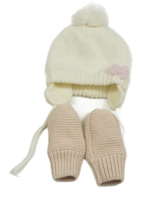 2 set - Bílá pletená podšitá čepice s bambulí + světlerůžové pletené rukavice