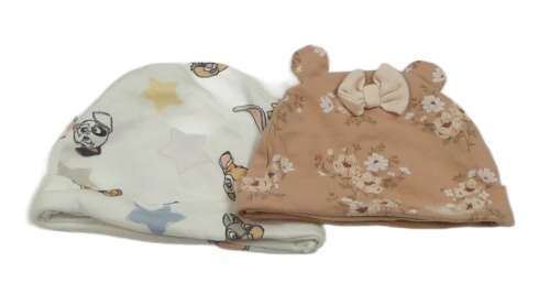 2x bavlněná čepice - bílá s hvězdami a Disney postavami + hnědá květovaná s mašlí a oušky