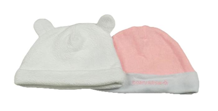 2x čepice - bílá s oušky + růžovo-bílá bavlněná
