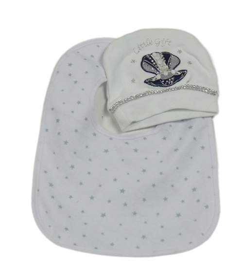 2set- bílá čepice s obrázkem s kamínky+ bílý bryndák se sdíčky