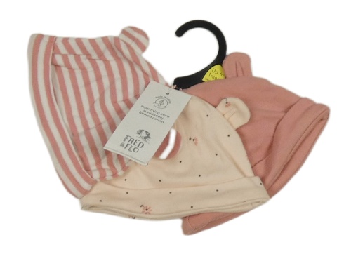 • Nové - 3x - Čepice s oušky - Růžovo/bílá pruhovaná, světlepudrová puntíkatá s kytičkami, růžová F&F