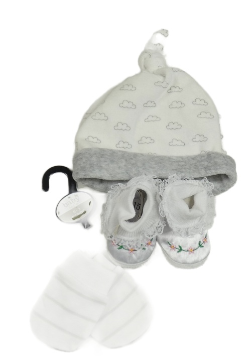 3set- bílo-šedá sametová čepice s mráčky+ pruhované rukavice+ capáčky