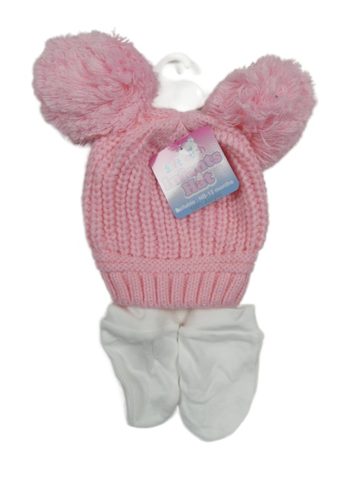 Nové - 2Set - Růžová žebrovaná pletená čepice s bambulemi Soft Touch + bílé rukavice