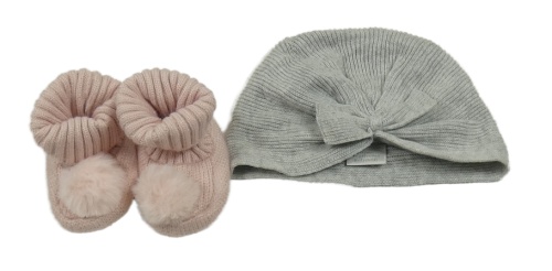 • 2set - Šedá melírovaná žebrovaná pletená turbanová čepice s mašlí + růžové pletené capáčky s bambulí vel. 16