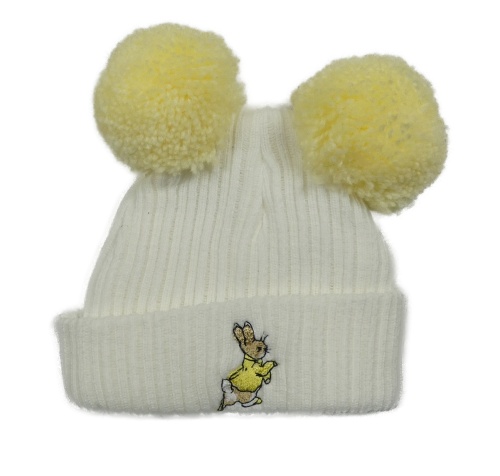 Bílo-žlutá čepice s králíčkem a bambulemi