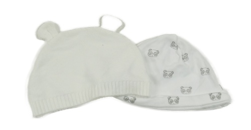 2x čepice - bílá úpletová + bílá s pandami